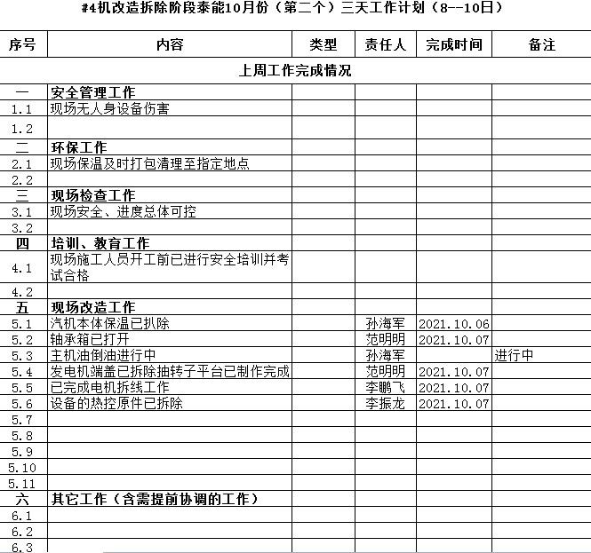 2021年10月6日,公司新4#机改造工程正式启动,汽机改造项目部、上海电气、淮南泰能三方人员在汽轮机平台进行了工程开工前的部署安排。 本次新4#机改造工程是公司从设备安全、经济效益等多方面综合考虑,将原4#汽轮机进行保护性拆除并安装上海电气集团生产的新汽轮机,从而实现整体替换。该工程由上海电气集团EPC总包,淮南泰能负责现场安装,总工期50余天,施工人员近40人,汽机、电气、热控各专业施工作业上百项。 一、防风险、除隐患,安全、环保管控打好提前量 本次改造工程位于汽轮机平台,吊装、焊接、受限空间等作业交叉进行,为了不影响其他系统、设备正常运转,不发生人身、设备伤害,安全、高效地完成本次4#机改造工程。安健环部从源头抓起,在人员资质审查、安全教育培训、三措两案审核、施工作业审批等方面层层把关,与项目部、施工方安全员各司其职,共同“查漏补缺”,发现问题立查立改;同时充分运用4#、5#炉改造期间优秀的管理经验,安全、环保工作提前做、提前抓,将安全、环保工作同等对待,摆在工程建设的首要位置,为本次工程保驾护航,成为该工程的“安全管家”。 二、列计划、抓落实,三天小计划串连大目标 本次改造工程时间紧、施工难度大,伴随着年末汽量的回升,新 4#机早投产一天就能多创造一天经济效益。汽机改造项目部按照11月底投产发电的总体目标统筹安排各专业工作,同时三天制定一个小计划,梳理工作重点,明确各自责任;项目部定期召开三方工程例会汇报施工进度、通报现场考核、沟通协调事宜、制定下阶段计划,将三天小计划落到实处;各专业明确分工,相互配合,通过三天小计划管控好工程建设安全、质量和进度,通过每一个三天小计划串联起工程建设大目标,于寻常处见功力,于细微处见真章,从点点滴滴做起,力争高质量完成本次改造工程。 三、相互配合、牛刀小试,发电机抽转子工作显成效 10月9日计划进行发电机抽转子作业,这也是本次工程的一个重要环节。为了该项作业顺利完成,确保后续施工能够如期进行,项目部召开专业协调会,明确各单位、各专业分工,现场由作业负责人统一指挥,做到令出一人;安健环部负责现场总体安全监护;汽机、电气、机务各专业负责协调配合。10月9日上午8点,发电机抽转子作业正式开始,到上午10点抽转子作业一次性顺利完成,全程安全可控,指挥配合得当,各环节衔接有序,前期各项准备,三方相互配合也初显成效。 随着新4#机改造工程的启动,相信在各方的共同努力下,该项目一定能够圆满完成、如期投产,为公司创造更大的经济效益。